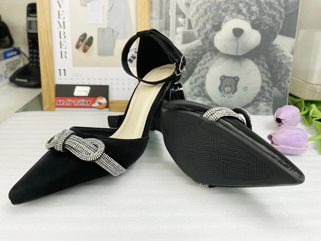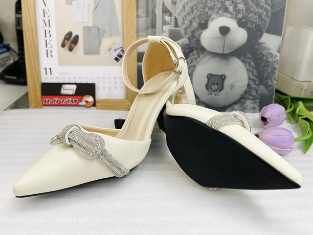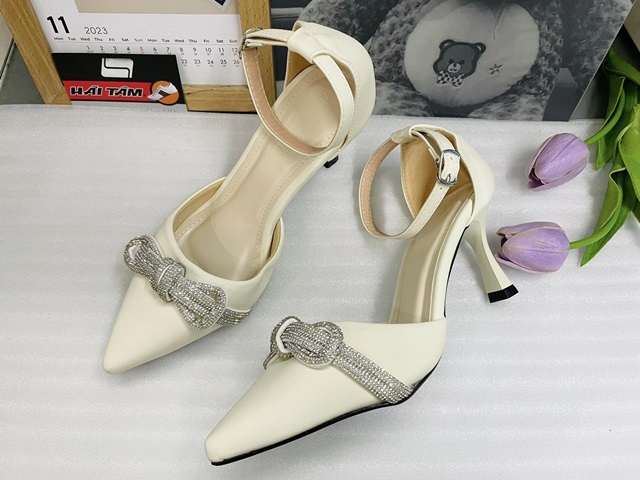 Kiểu dáng: giày cao gót bít mũi, bít gót, hở eo phối dây gài cổ chân chắc chắn, thanh lịch. Thiết kế dáng mũi nhọn tăng hiệu ứng thon gọn. Gót giày cao 7cm được thiết kế cách điệu gót nhỏ thanh mảnh với ưu điểm tôn dáng tăng chiều cao mà còn vững chắc, giúp cho các nàng hoàn toàn tự tin trên từng bước chân. Kiểu dáng hiện đại kết hợp cùng dây xoàn quấn thắt nơ làm điểm nhấn, giúp cho đôi giày thêm phần sang trọng, quý phái.