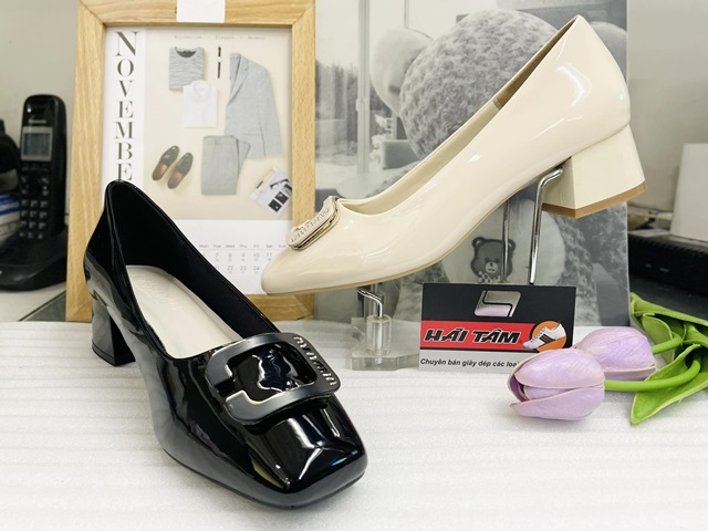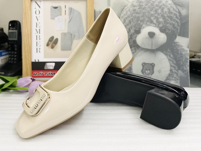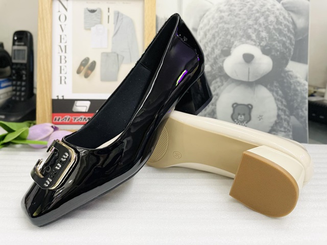 Thiết kế mũi vuông hiện đại đứng dáng và thoải mái bàn chân, phối khoá kim loại siêu xinh tạo điểm nhấn cho tổng thể, form dáng công sở thanh lịch.