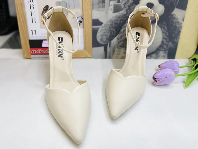 Kiểu dáng: giày cao gót bít mũi, bít gót phối dây gài cổ chân chắc chắn, thanh lịch. Thiết kế dáng mũi nhọn xẻ tim tăng hiệu ứng thon gọn mà còn che khuyết điểm cho đôi chân.